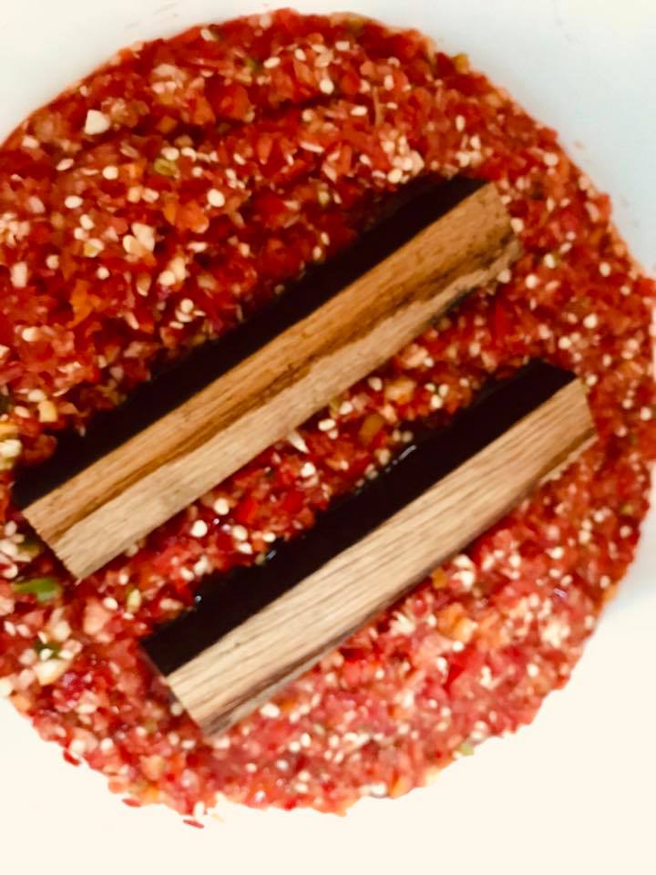 Finally got down to Eastern Market in Detroit to pick up some peppers for this years batch of hot sauce. Though I had missed the season, but there were plenty to be had. Bought over 7lbs of assorted peppers including Serrano, cayenne, cherry bombs. Stemmed, chopped, processed with 5% salt and 5% garlic. Filled a 2 gallon fermenting bucket about 2/3 the way. Added two barrel staves I won from Stearns (Ben) in last years auction. Plastic wrap on top of all that, and weighted down with a ziplock bag filled with water. Gonna let this go an easy 6 months.