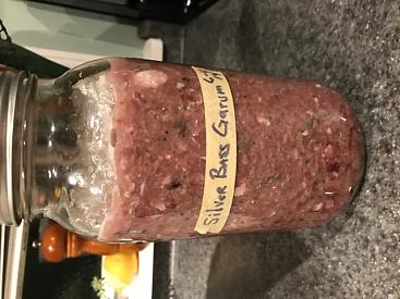 Not really lacto fermented, or maybe even fermented. Trying a recipe out of the Noma cookbook (thanks again Ben). I have a batch of garum started. It’s an old Roman recipe for fish sauce. Grind up some fish, guts and all. Mix in a bunch of salt and some water. Cover and put into a container, then wait. After a number of months, the fish breaks down and creates a fish sauce. Strain and use. It’s similar to Asian fish sauce. Used some silver bass from yesterday’s fishing trip.