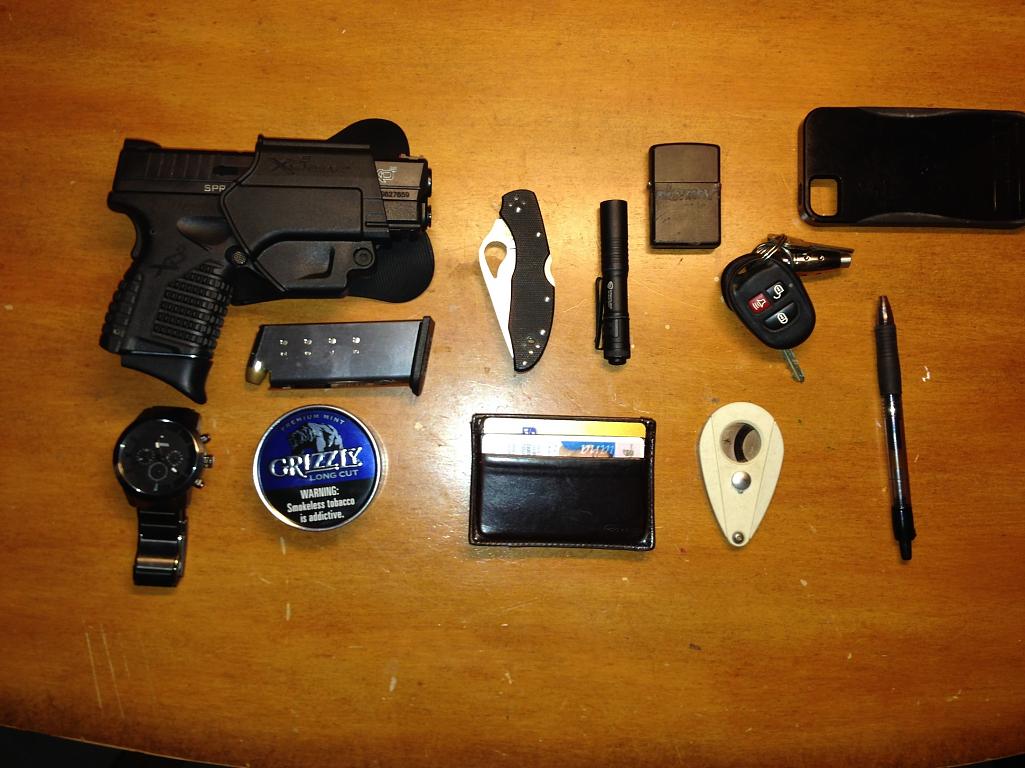 And then when 'not' taking my daughter to school my Springfield XD 9mm. And of course I always have one of my Spyderco or Swiss Army Knifes in pocket.