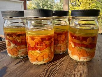 My first batch of chilies and garlic bubbled for nearly 2 months in approx 4% brine. Garlic still had a bit to go, but the chilies were ready. Spicy, tangy, hot! A bit of kham showed up, so I called it. Eight quart jars (initially packed tight) made about six pints of really good hot Sriracha! Another batch is down and still good few green chilies (Fresno, jalapeño, mexibell) on the bushes. One of my Habanero Caribbean Red is also loaded, so I will do something special there. Got in a few new books with plenty of ideas.