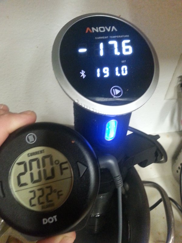 Customer support at Anova doesn't seem to have done anything since they asked me a week ago to confirm my address. Personally, I thought the -1768F degree reading that it was sending over BT was kind of droll considering that absolute zero is only -460F. |