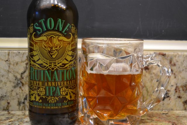 It's a good beer standing on its own. However it doesn't seem all that much like Ruination. Ruination is this dry, bitter beer that's all buttering hops. I guess to get the higher alcohol in the 10th they had to increase the malt to an extent that it is more noticeable - the overall balance changes from utter imbalance to something not quite as extreme. Again it's a good beer, just not what I was imagining. I'd say it reminds me more of Lagunitas Maximus than of regular Ruination. Still love the label though