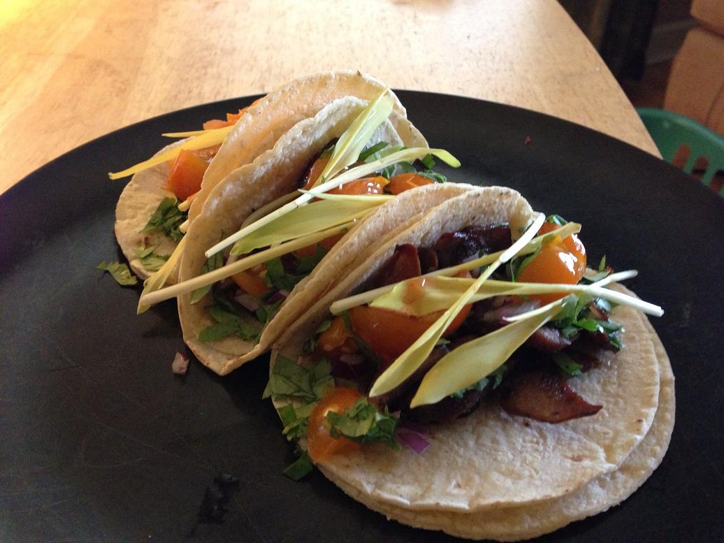 Smoked pork lengua (tongue) tacos, with popcorn sprouts and pickled tomatoes.
