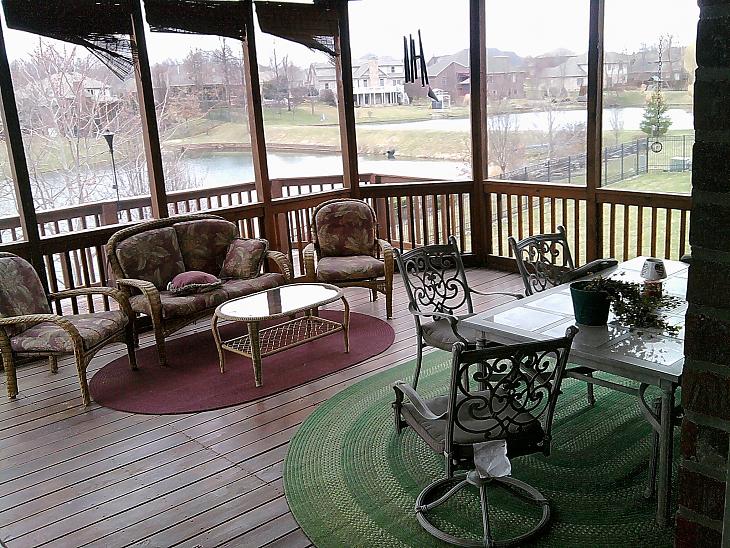 48 inch flat screen mounted on the brick wall to the right.. Grill outside the screened in area to your left, to a winding staircase down to the back yard, cement patio underneath with another table, and small veggie garden. Out in the yard is a massive greens garden, beautiful in the summer, with a large dock that harbors our paddle boat on the lake, small table and two chairs for fishing.. Bass and blue gill mostly. Heaven on earth in the summer.. Also the little brothers have a humungous swingset/play area.
