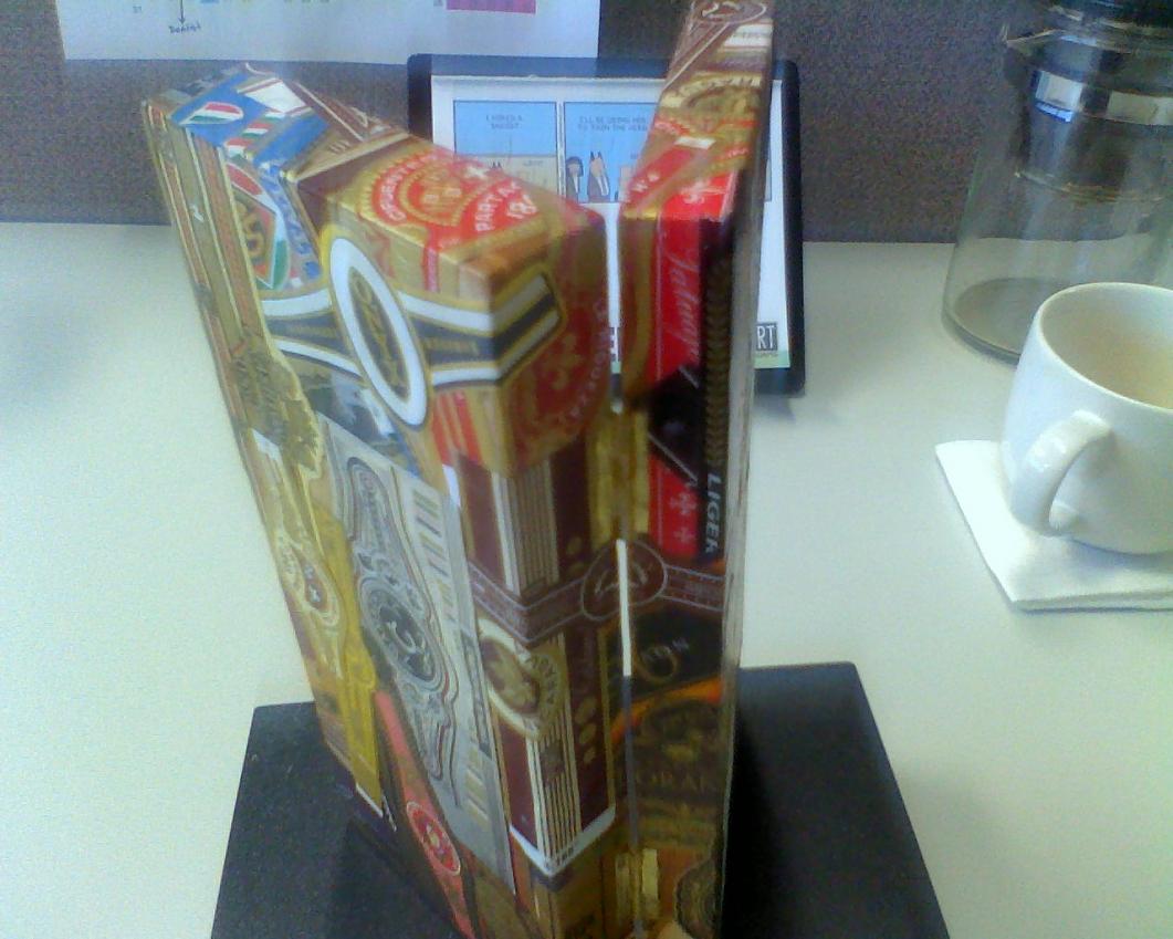 Holds 3 cigars, 56RG x 6" Something for him to pop a few smokes in when he steps out....he usually uses a ziploc bag. Ah to be 25 again! Lousy lighting in my office....