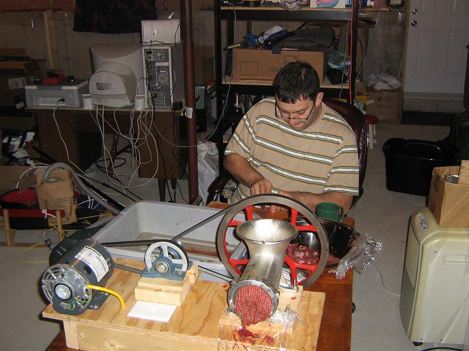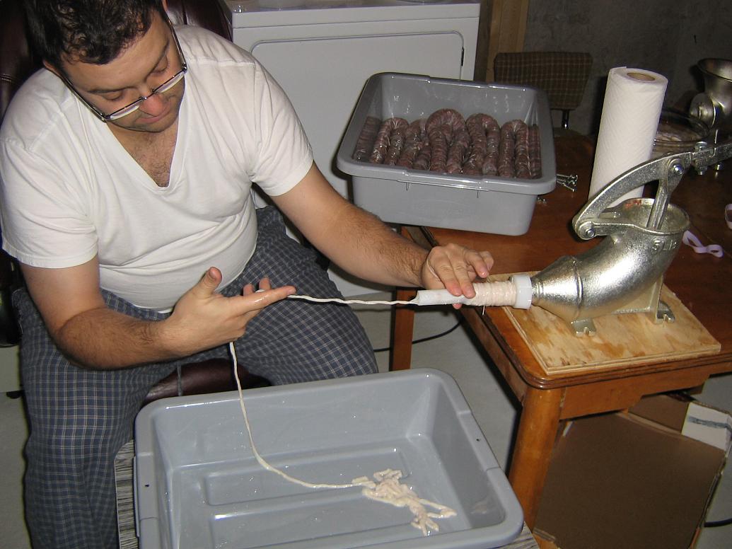 A buddy and I have been doing this for the last couple of falls, working on our recipes and techniques. We have made some improvements since we started, including adding a motor to the hang grinder, buying a separate stuffer and moving from synthetic to natural casings. Here are a few pics from our latest efforts this past weekend. 1 - our grinder at work 2 - sliding the natural hog casing onto the stuffing tube 3 - that's a lot of sausage 4 - that looks tasty, eh? We made about 40 lbs of our usual recipe, and another 30-35lbs of 2 other recipes. We vacuum packed the works of it to freeze. Should last us for a couple of months.